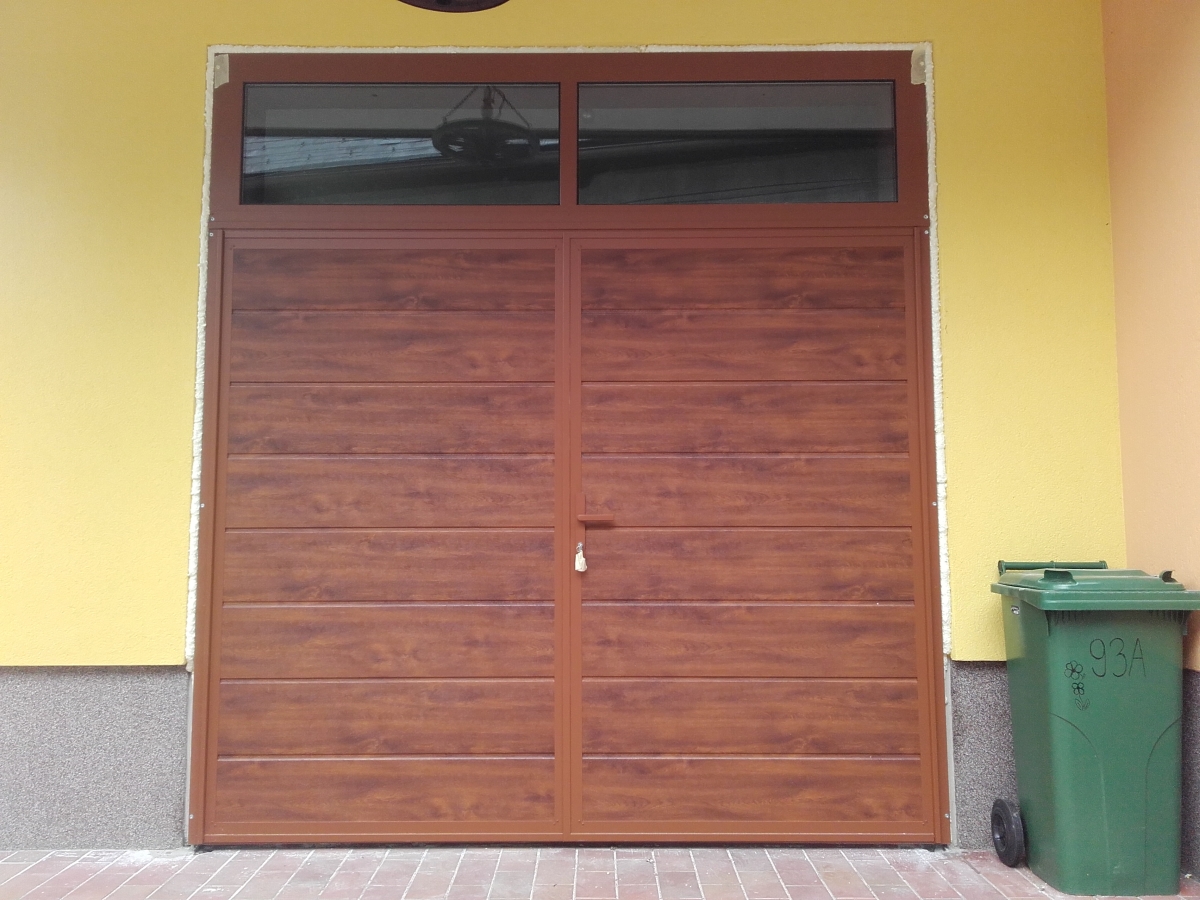Dvokrilna garažna vrata v imitaciji zlatega hrasta ter stekleno nadsvetlobo.